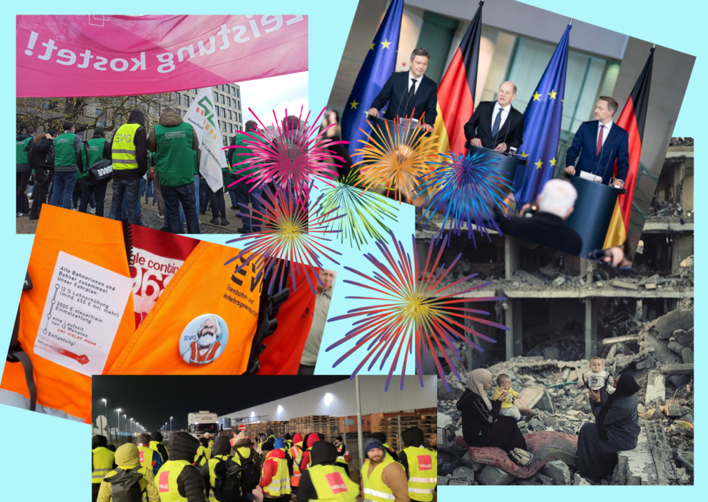 Zumindest das ist etwas, worauf man positiv zurückschauen kann im Jahr 2023: Die Gesamtheit der Arbeitenden, die Arbeiter:innenklasse, hat mehrfach gezeigt, wie das Kräfteverhältnis sich verändern lässt. Im Frühjahr genauso wie in den letzten Monaten gab es viele Bereiche in denen gestreikt wurde oder in denen die Streikbereitschaft hoch war. Ablesen ließ sich das an den hohen Forderungen, die gestellt wurden (teilweise wurden über 20 % Lohnerhöhung gefordert). Angesichts der Teuerung und der Unverschämtheit, mit der sich Kapitalbesitzer und Vorstände überall die Taschen vollmachen, waren und sind die Forderungen mehr als gerechtfertigt. Auch wenn die Gewerkschaftsspitzen kaum die Streikbereitschaft ausgenutzt haben, um in den Verhandlungen das Maximale rauszuholen, im Vergleich zu vergangenen Jahren hat sich die Stimmung durch diese Tarifrunden und die Streikaktionen verändert. Das ist etwas, woran wir 2024 anknüpfen können: Mit Selbstbewusstsein und Entschlossenheit dafür eintreten, dass das kommende Jahr besser wird. Dass allen Ausbeuter:innen und Kriegstreiber:innen ihre menschenverachtende Arroganz vergeht und die Solidarität der Arbeitenden an ihre Stelle tritt.