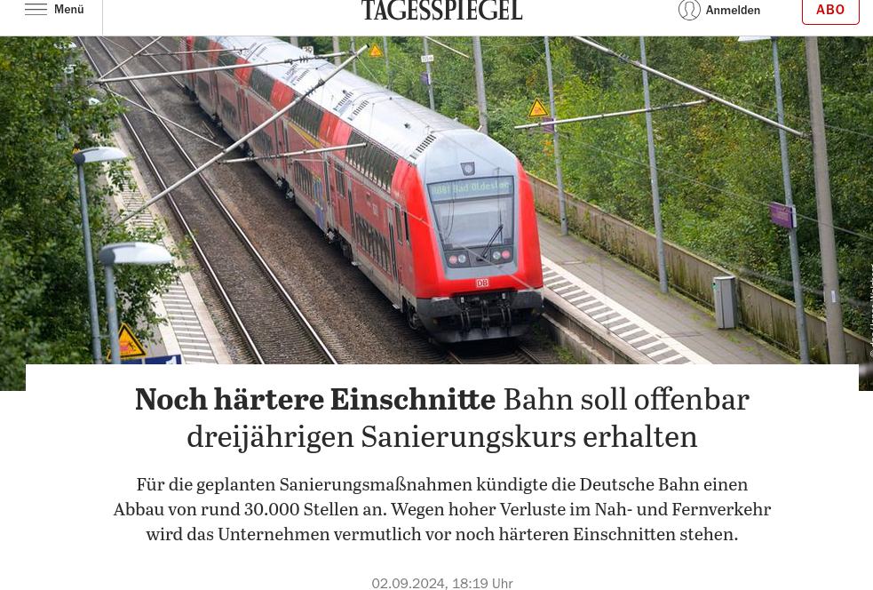 Am Dienstag überraschte die Presse damit, dass die DB ein Sanierungskonzept erarbeitet habe mit dem Namen „S3“ und vielleicht noch größerem Stellenabbau mit Ausdünnung des Fernverkehrs. Tja. Was der Vorstand heute erzählt, ist morgen schon nicht mehr wahr. Lügen die einen voll? Oder haben die keinen besseren Plan, weil sie selbst die Krise zu verantworten haben und erzählen einfach irgendwas? Man weeeeßet nich.