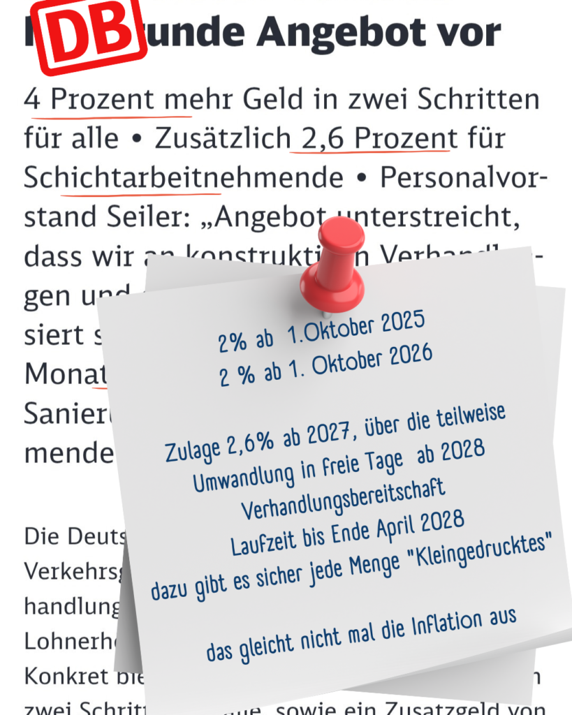 Das sogenannte Angebot der DB für über 100.000 Beschäftigte im Konzern gleicht nicht mal die Inflation aus. 37 Monate Laufzeit bis April 2028 sind ein Witz. Warum nicht gleich 50 Monate? Oder 137?