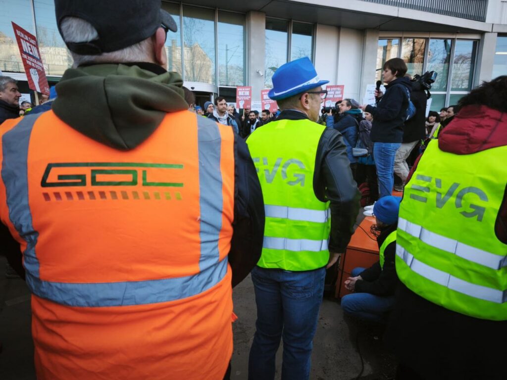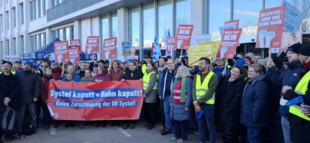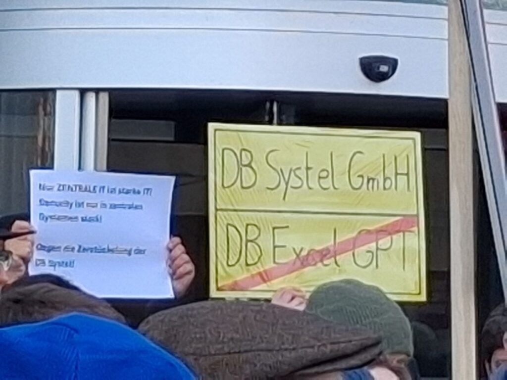 Am 24. Februar gab es an drei Standorten – Frankfurt, Erfurt, Berlin – Protest von mehreren hundert Kollegen von Systel und nochmal am 11. März in Berlin. Jetzt gibt es die Zusage, dass es keine Zerschlagung geben wird. Die Proteste haben sicherlich geholfen, insofern ein Teilerfolg. Aber keine Erleichterung, denn die Stellenreduzierung um 1.900 bleibt und damit können wir natürlich nicht zufrieden sein. Wenn demnächst Anzeigen auf dem Bahnsteig wieder „Geisterzüge“ ankündigen oder die Updates nicht laufen oder ein Cyberangriff seinen Weg ins System findet, dann könnte Grund die Sparmaßnahmen bei Systel sein. Systel ist zwar Teil des Geldwäsche-Systems innerhalb des Konzerns. Aber für die Kollegen sieht die Welt nicht rosig aus.